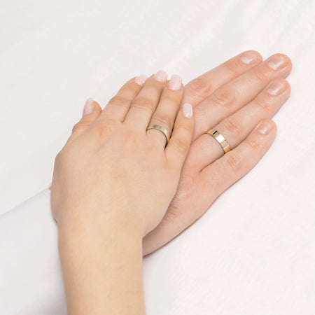 Klasické Plochý zlaté snubní prsteny o šířce 4 a 5 mm, ručně vyráběné v klenotnické dílně Gremari, jsou jedinečné klasické snubní prsteny z 14K (585) zlata, které jsou nadčasovým symbolem věčné lásky. Prsten, široký 4 a 5 mm a tlustý 1,2 mm, vypadá na ruce krásně, je nenápadný a dokonale ladí s dalšími šperky, jako jsou náramky nebo prsteny s drahými kameny, či zásnubní prsten. Nabízíme zlaté snubní prsteny ve třech drahých odstínech: klasické žluté zlato potěší svým teplým leskem a je nadčasovým symbolem manželství; elegantní bílé zlato má moderní, chladivý, zrcadlový lesk připomínající platinu; zatímco romantické růžové zlato okouzlí svým jemným, teplým a módním odstínem. Každý pár snubních prstenů je vyroben v naší dílně na zakázku zákazníka. Je možné je dále personalizovat přidáním rytiny s vlastním textem. Snubní prsteny balíme do elegantní šperkovnice, která odpovídá charakteru vaší ceremonie.
