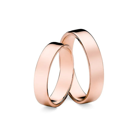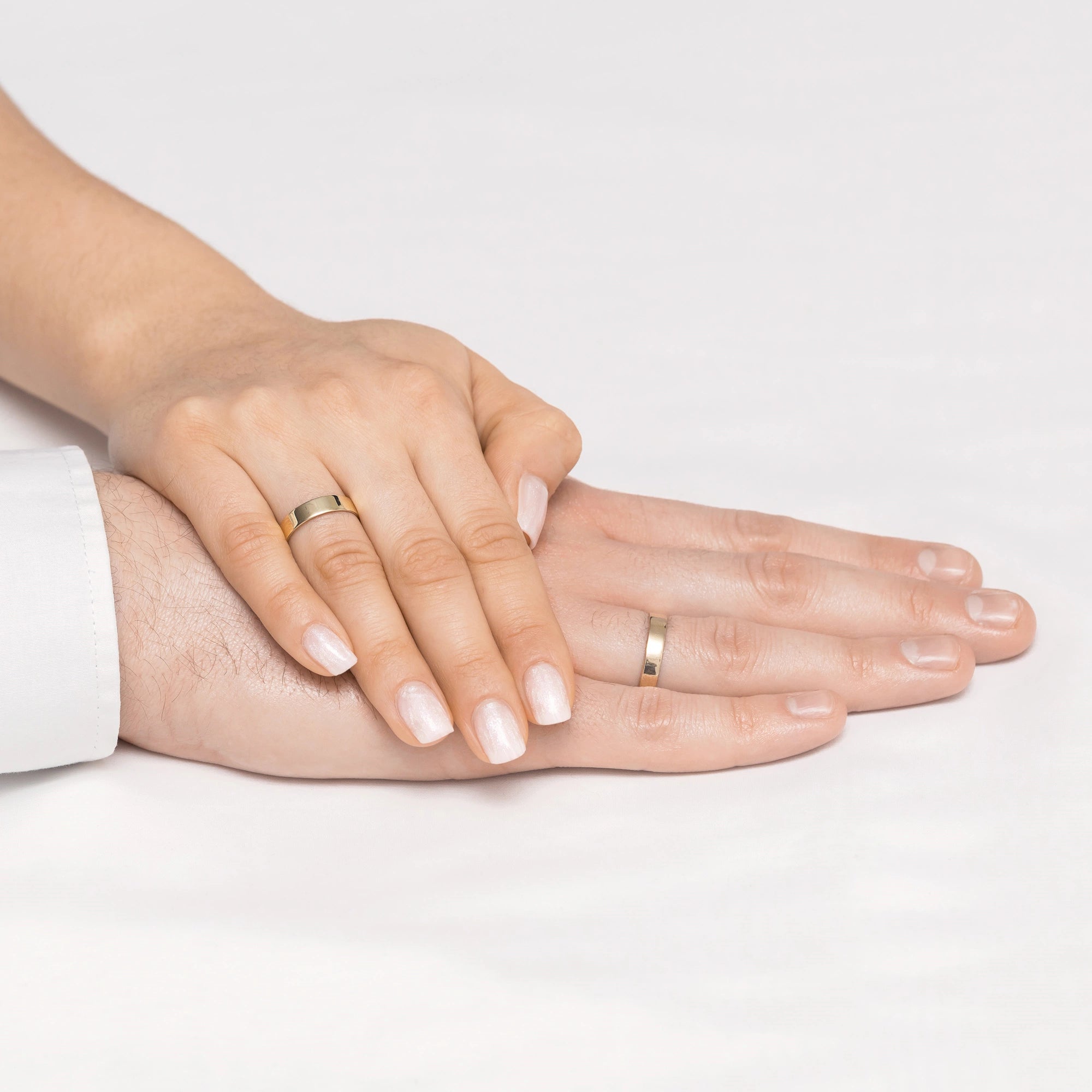 Klasické Plochý zlaté snubní prsteny 4mm Ručně vyráběné v klenotnické dílně Gremari, jedinečné klasické snubní prsteny z 14K (585) zlata jsou nadčasovým symbolem věčné lásky. Prsten, široký 4 mm a tlustý 0,90 mm, vypadá na ruce krásně, je nenápadný a dokonale ladí s dalšími šperky, jako jsou náramky nebo prsteny s drahými kameny, či zásnubní prsten. Nabízíme zlaté snubní prsteny ve třech drahých odstínech: klasické žluté zlato potěší svým teplým leskem a je nadčasovým symbolem manželství; elegantní bílé zlato má moderní, chladivý, zrcadlový lesk připomínající platinu; zatímco romantické růžové zlato okouzlí svým jemným, teplým a módním odstínem. Každý pár snubních prstenů je vyroben v naší dílně na zakázku zákazníka. Je možné je dále personalizovat přidáním rytiny s vlastním textem. Snubní prsteny balíme do elegantní šperkovnice, která odpovídá charakteru vaší ceremonie.