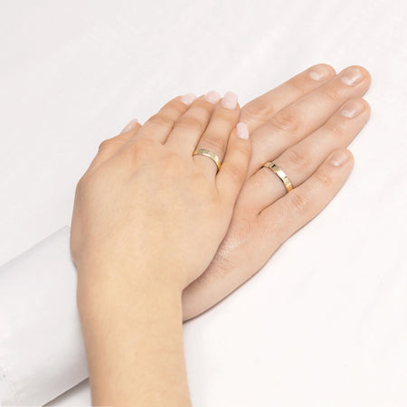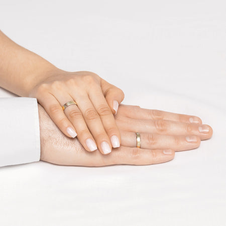 Klasické ploché prsteny na svatební prsteny se S drážkou, šířka 4 mm, ručně vyráběné v klenotnické dílně Gremari, jedinečné klasické svatební prsteny z 14K (585) zlata, jsou nadčasovým symbolem věčné lásky. Prsten, široký 4 mm a tlustý 1,2 mm, vypadá na ruce krásně, je nenápadný a dokonale ladí s dalšími šperky, jako jsou náramky nebo prsteny s drahými kameny, či zásnubní prsten. Nabízíme zlaté svatební prsteny ve třech drahých odstínech: klasické žluté zlato potěší svým teplým leskem a je nadčasovým symbolem manželství; elegantní bílé zlato má moderní, chladivý, zrcadlový lesk připomínající platinu; zatímco romantické růžové zlato okouzlí svým jemným, teplým a módním odstínem. Každý pár svatebních prstenů je vyroben v naší dílně na zakázku zákazníka. Je možné je dále personalizovat přidáním rytiny s vlastním textem. Svatební prsteny balíme do elegantní šperkovnice, která odpovídá charakteru vaší ceremonie.