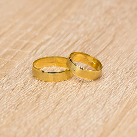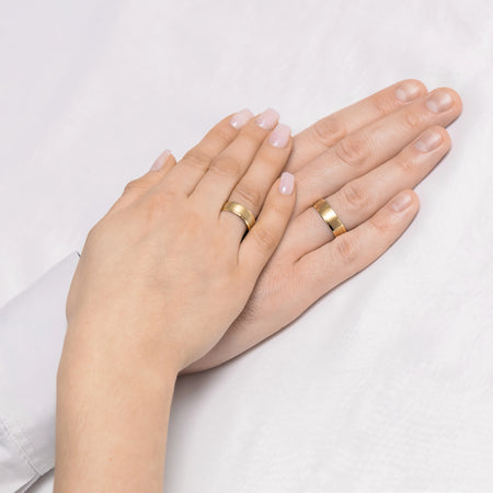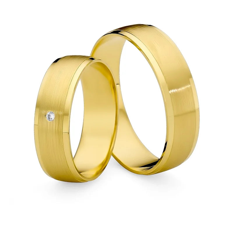 Žluté zlaté snubní prsteny se zirkony s matným povrchem, šířka 6 mm. Ručně vyráběné v klenotnické dílně Gremari, jedinečné klasické snubní prsteny z 14K (585) zlata jsou nadčasovým symbolem věčné lásky. Prsten o šířce 6 mm vypadá na ruce krásně, je nenápadný a skvěle ladí s dalšími šperky, jako jsou náramky nebo prsteny s drahými kameny, případně zásnubní prsten. Každý pár snubních prstenů je vyroben v naší dílně na zakázku zákazníka. Je možné je dále personalizovat přidáním rytiny s vlastním textem. Snubní prsteny balíme do elegantní šperkovnice, která odpovídá charakteru vaší svatby.