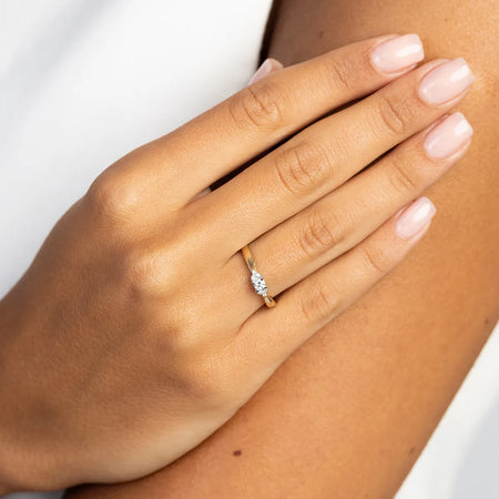Gold Ring with Lab-grown Diamonds Handcrafted in the traditional Gremari jewelry workshop, this 14K gold ring with 0.10ct lab-diamond and 6 lab-grown diamonds with a total mass of 0.03ct, embodies timeless beauty and masterful artistry. Set in 14K gold with a 585 hallmark, the gemstones combine elegance, subtlety, and durability. The ring is available in three color options: yellow gold, white gold, and rose goldsimply choose your preferred variant above.