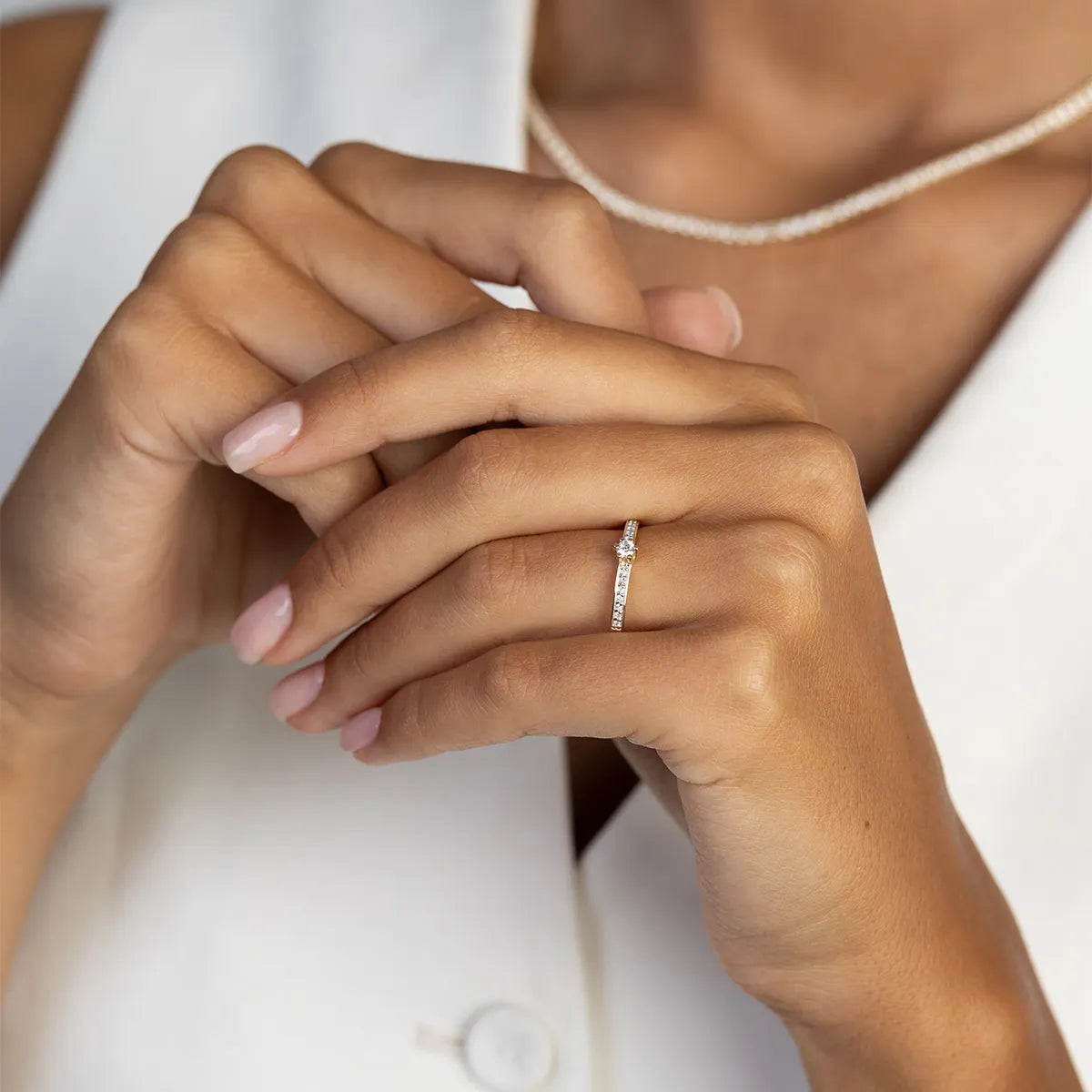Gold Ring with Lab-grown Diamonds Handcrafted in the traditional Gremari jewelry workshop, this 14K gold ring with 0.10ct lab-diamond and 14 lab-grown diamonds with a total mass of 0.07ct, embodies timeless beauty and masterful artistry. Set in 14K gold with a 585 hallmark, the gemstones combine elegance, subtlety, and durability. The ring is available in three color options: yellow gold, white gold, and rose goldsimply choose your preferred variant above.