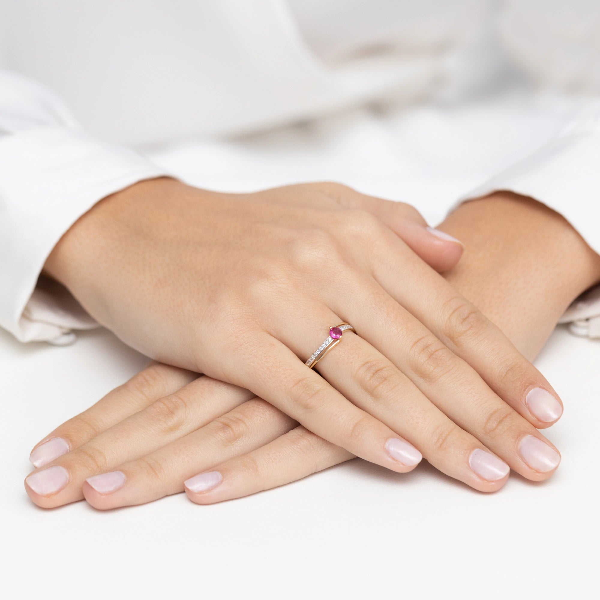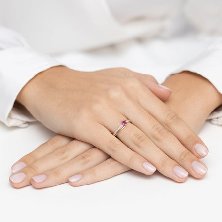 Gold Ring with Red Zirconia Waves Handcrafted in the traditional Gremari jewelry workshop, this gold ring set in 14K gold with a 585 hallmark is a charming, delicate accessory that emphasises the beauty of your hands. The subtle design makes this gold ring a perfect match for other jewellery, such as diamond rings and gold bracelets. A gold ring is the essence of elegance and class. It is a versatile accessory that you can wear every day and on special occasions. Made of the highest quality gold, it impresses with its timeless shine and durability. It is the perfect way to emphasize your style and add a touch of luxury to any outfit.Zirconia stones are created in laboratory conditions, and their high hardness and excellent optical properties make them one of the best diamond imitations available on the jewellery market. Their extraordinary ability to refract light makes them sparkle spectacularly with every movement. Gremari gold ring is packaged in an elegant box, which is perfect for giving as a gift. It comes with a jewelry tag showing the fineness, weight, and symbol of the metal ” even if it's a last-minute gift, you're covered!