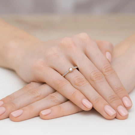 Ruční výroba v tradiční šperkařské dílně Gremari, tento 14K zlatý prsten s 0,10ct laboratorním diamantem a 10 laboratorně pěstovanými diamanty s celkovou hmotností 0,05ct, představuje nadčasovou krásu a mistrovské řemeslo.