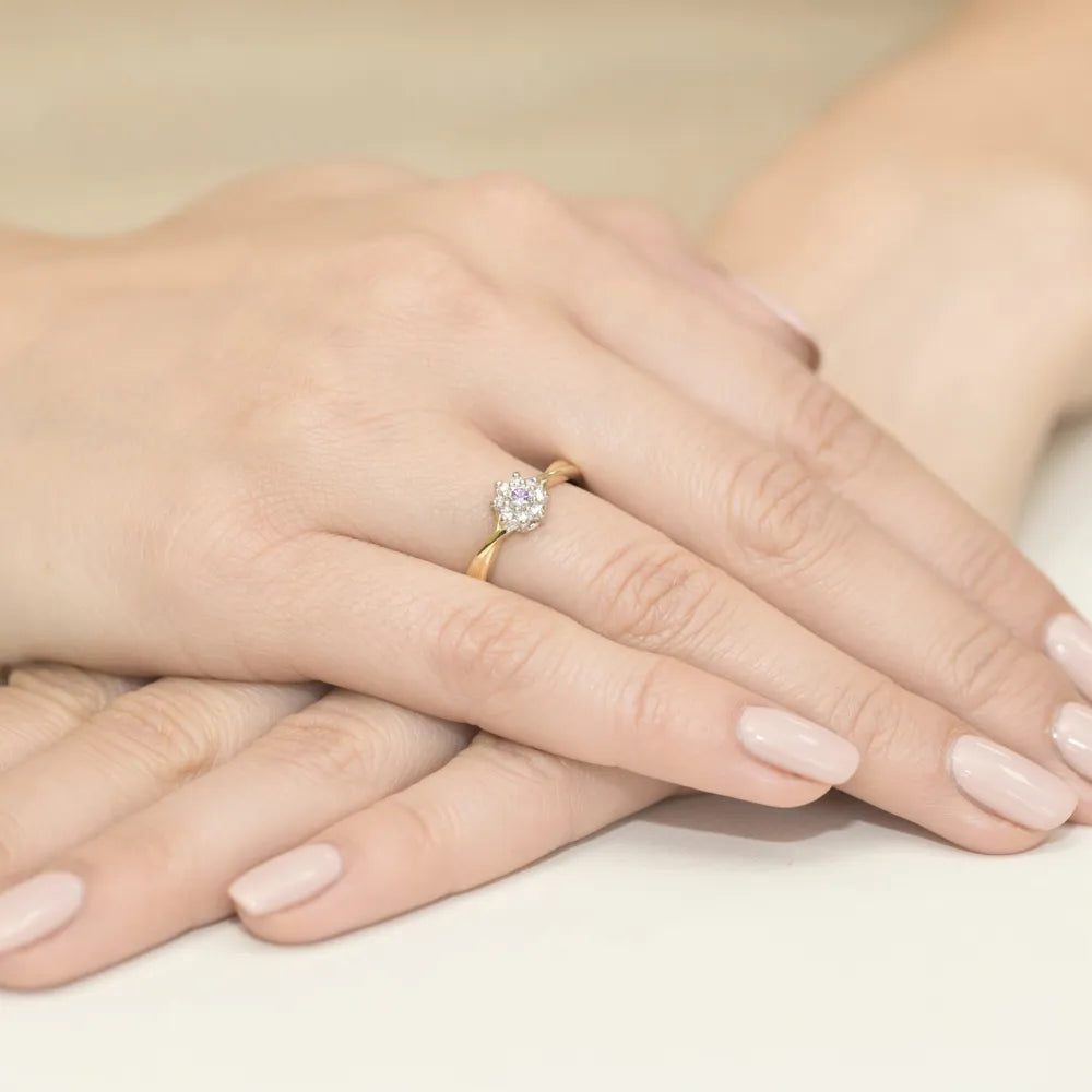 Zlatý prsten s 0,10ct ametystem a diamanty