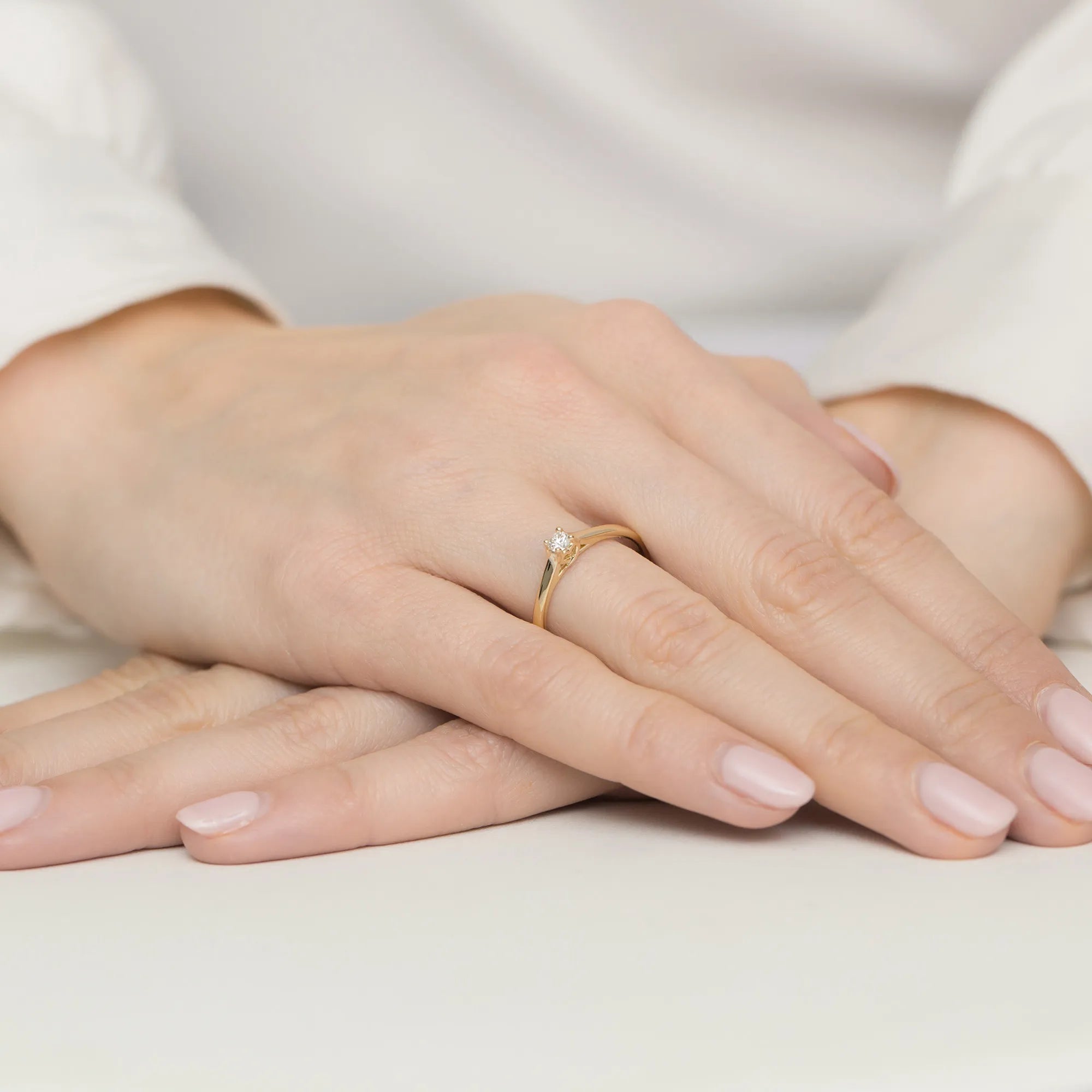Zlatý prsten s diamantem Ručně vyrobený v tradiční šperkařské dílně Gremari, tento 14karátový zlatý prsten s diamantem o hmotnosti 0,12 ct představuje nadčasovou krásu a mistrovské řemeslo. Osazený v 14karátovém zlatě s puncem 585, drahokamy spojují eleganci, jemnost a odolnost. Prsten je k dispozici ve třech barevných variantách: žluté zlato, bílé zlato a růžové zlato – jednoduše si vyberte preferovanou variantu výše.